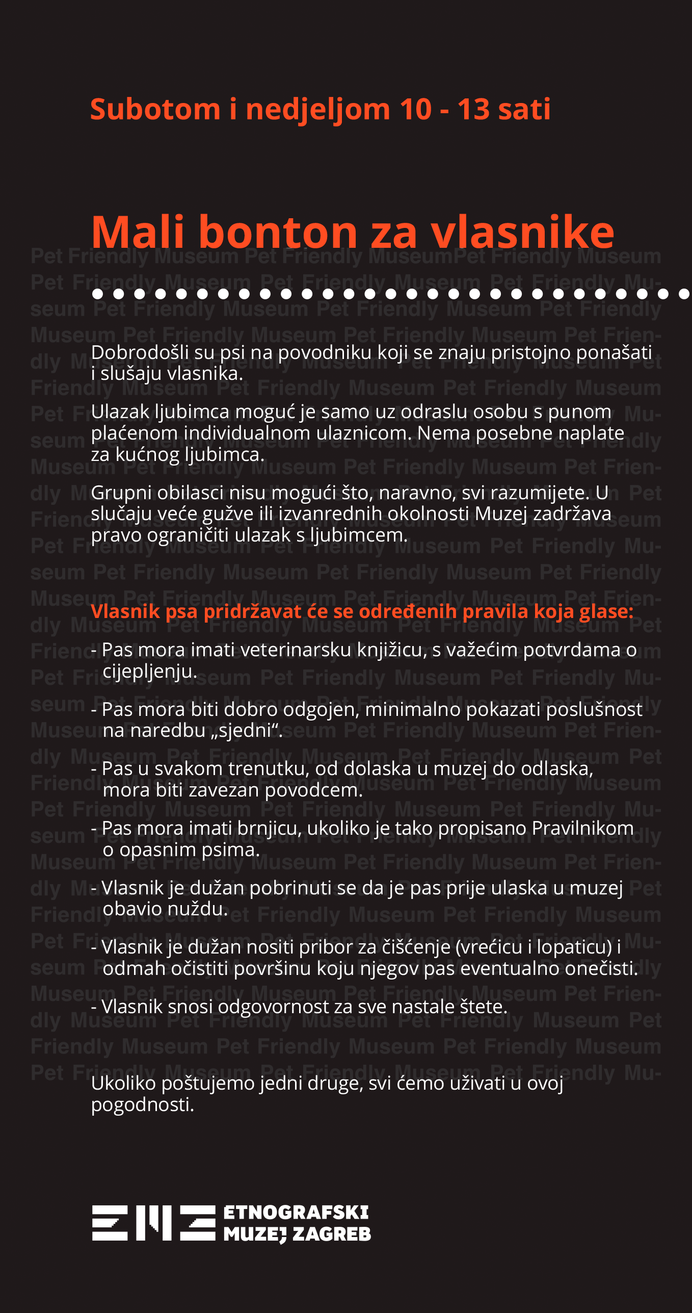 The Ethnographic Museum, with the support of the Zagreb Tourist Board, in 2015 became the first pet friendly museum in Croatia.